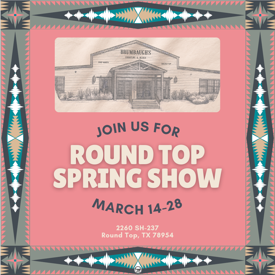 Read MoreBrumbaugh’s Furniture & Design returns to Round Top March 14–28 with a curated collection of timeless furniture and distinctive accessories that blend refined craftsmanship with a western edge. Located at 2260 SH-237 in Round Top, Texas, our space is a must-stop during the spring show, featuring one-of-a-kind pieces, rich textures, and elevated design meant to live beautifully in your home. Whether you are sourcing something special or simply soaking in the inspiration, we invite you to experience the Brumbaugh’s aesthetic in the heart of Round Top.