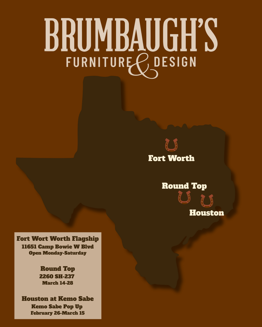 Calling all Houston Rodeo fans! We’ve partnered with our friends at Kemo Sabe to bring Brumbaugh’s Furniture & Design on the road. Stop by the Kemo Sabe pop up to experience our curated lounge, featuring signature pieces that blend Western character with elevated comfort. It’s the perfect place to take a break, soak in the rodeo energy, and see our furniture styled up close in true Texas fashion.