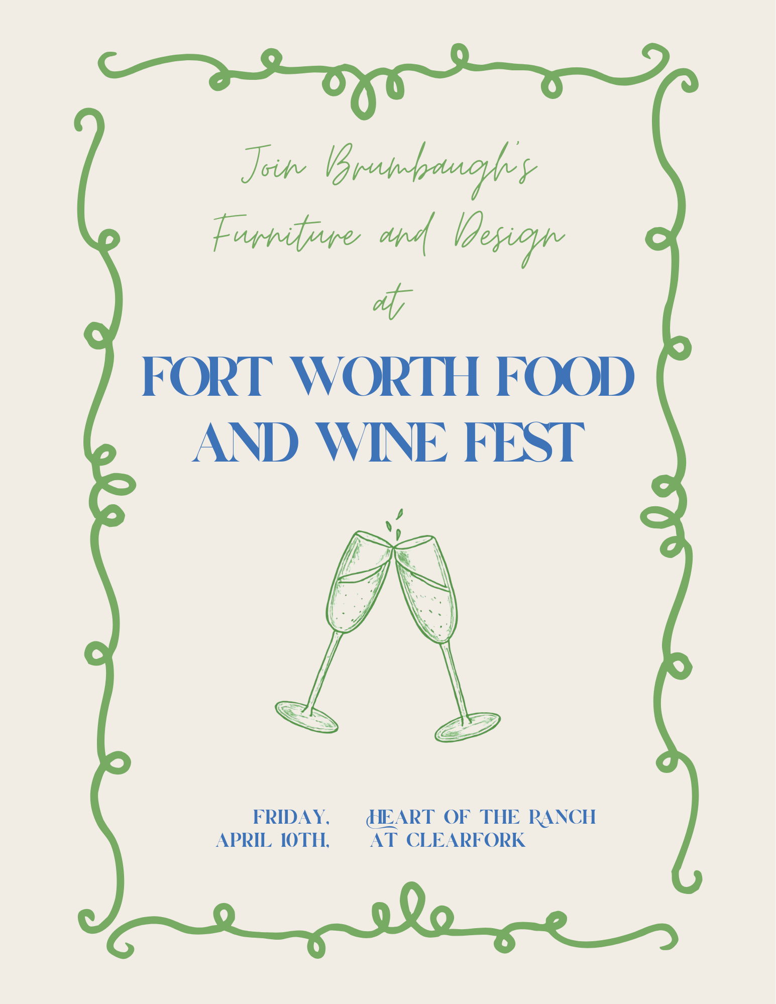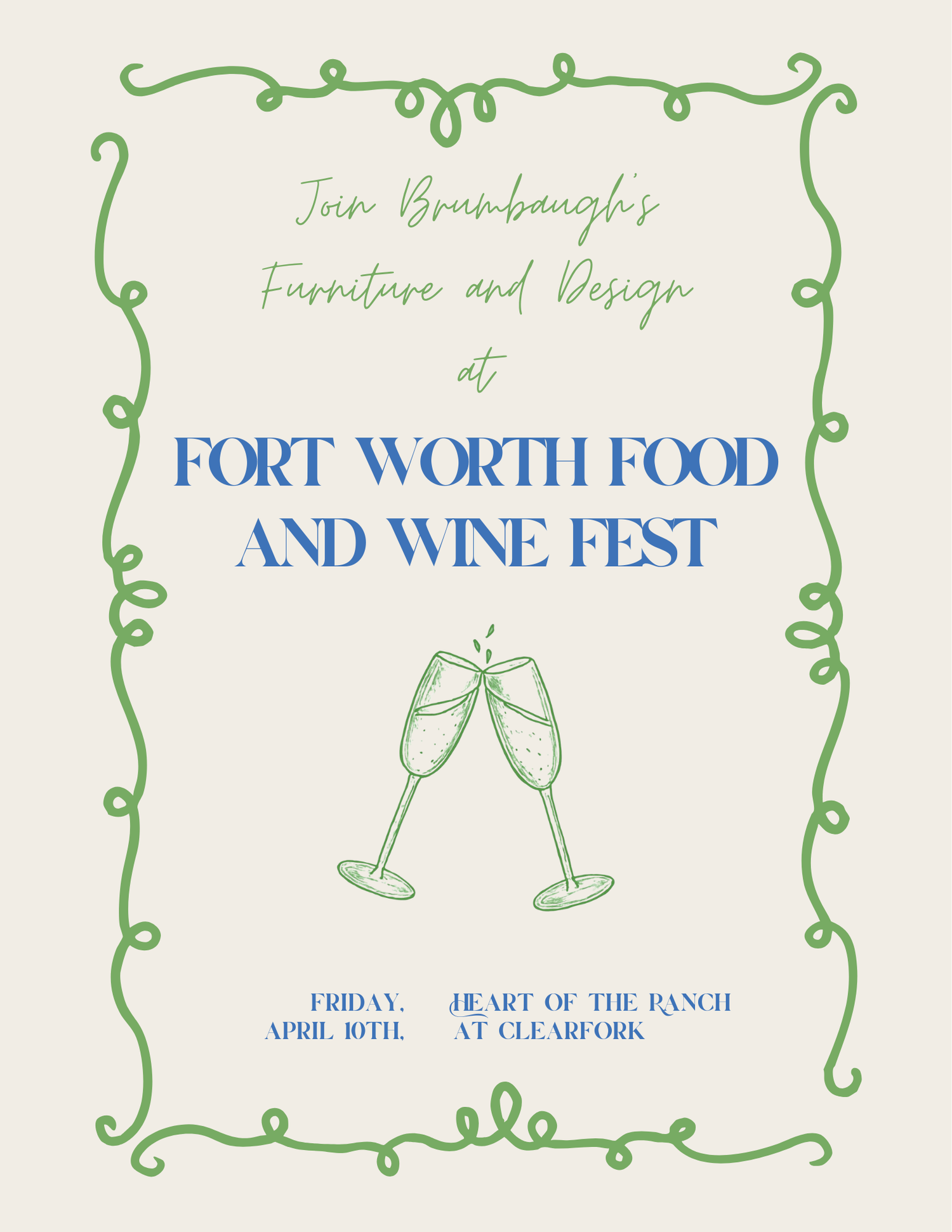 Come see Brumbaugh’s Furniture & Design at the Fort Worth Food + Wine Festival! Visit our booth to explore our furniture, enjoy live chain stitching, and take part in a champagne sabering! Tickets are available online at the Fort Worth Food + Wine Festival website.