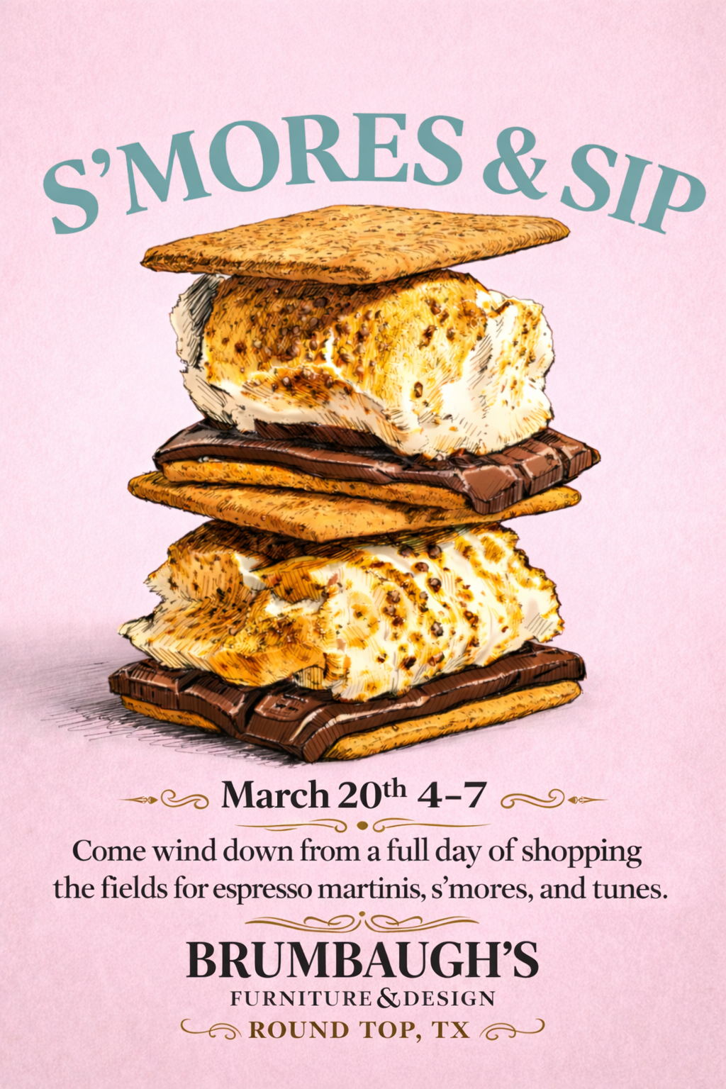 Join us for complimentary espresso martinis, gourmet s’mores, and laid-back tunes inside our Round Top showroom.