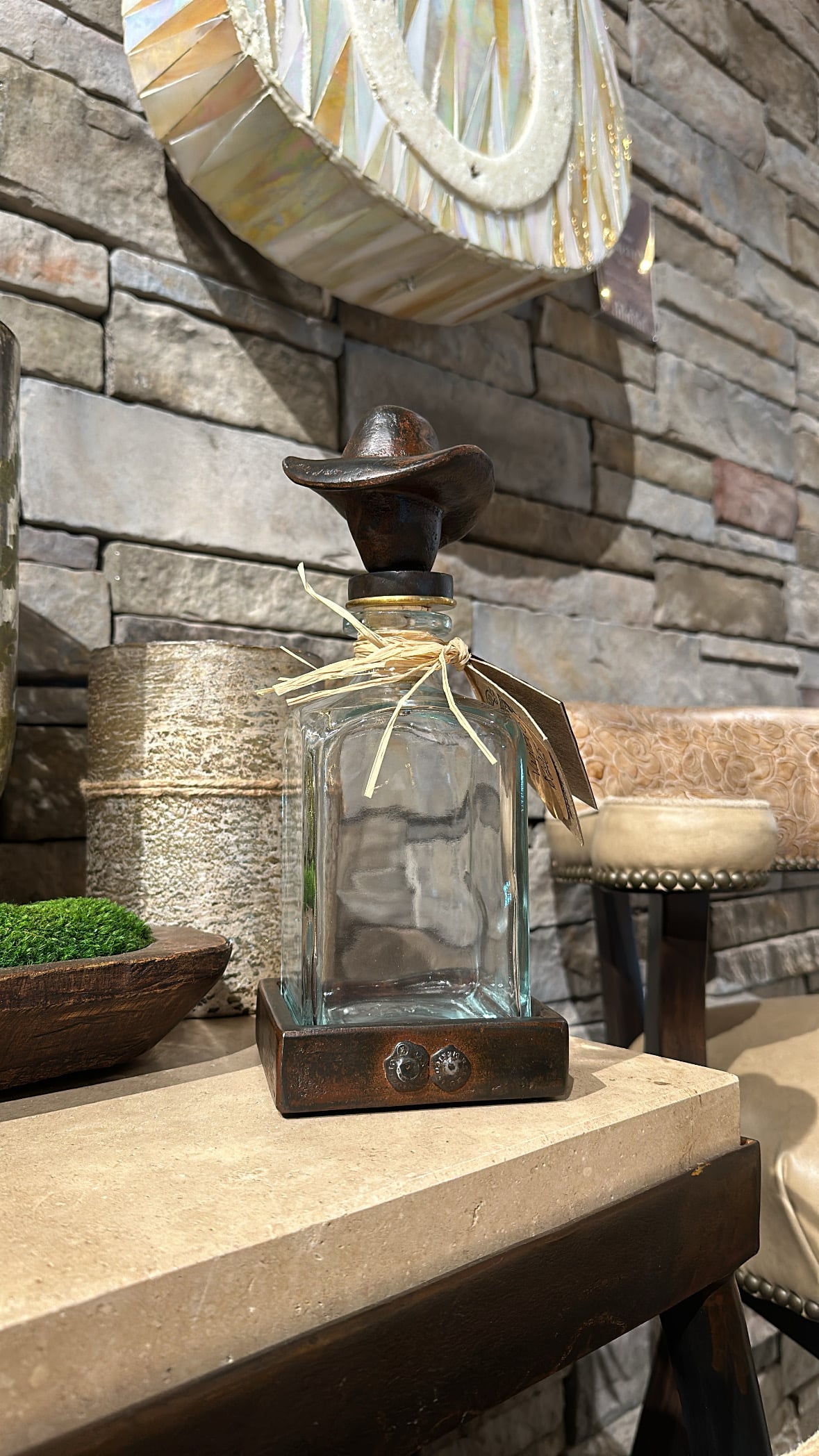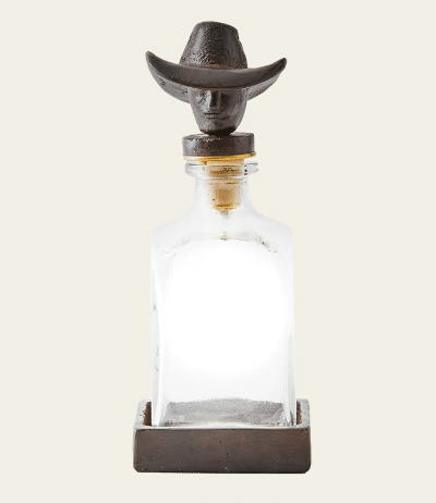 Western-themed cast iron decanter set featuring a vintage-style glass bottle and a matching iron coaster.